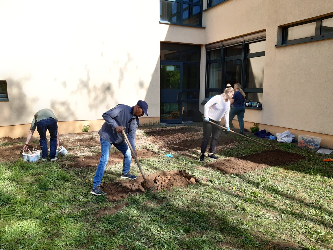 Am Ende haben wir auch noch einen Blühstreifen für Wildblumen anlegt. Wir freuen uns schon jetzt auf das Bepflanzen der Beete.
