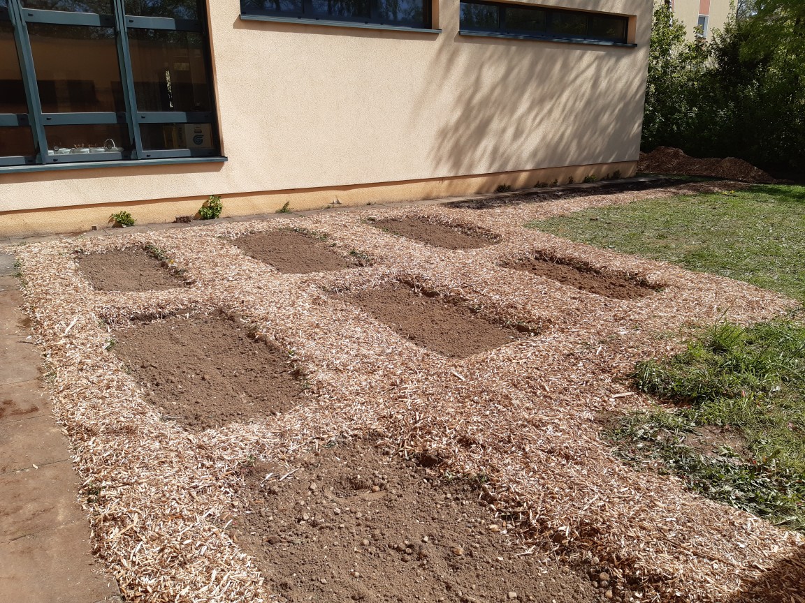 Wir haben die zukünftigen Beete von der Grasnarbe und Unkraut befreit und die Erde gelockert. Als alle Beete vorbereitet waren haben wir das Mulchmaterial verteilt. Der Forstbetrieb Menke aus Ehrenfeld hat uns freundlicherweise das Mulchmaterial gespendet. Herzlichen Dank dafür!