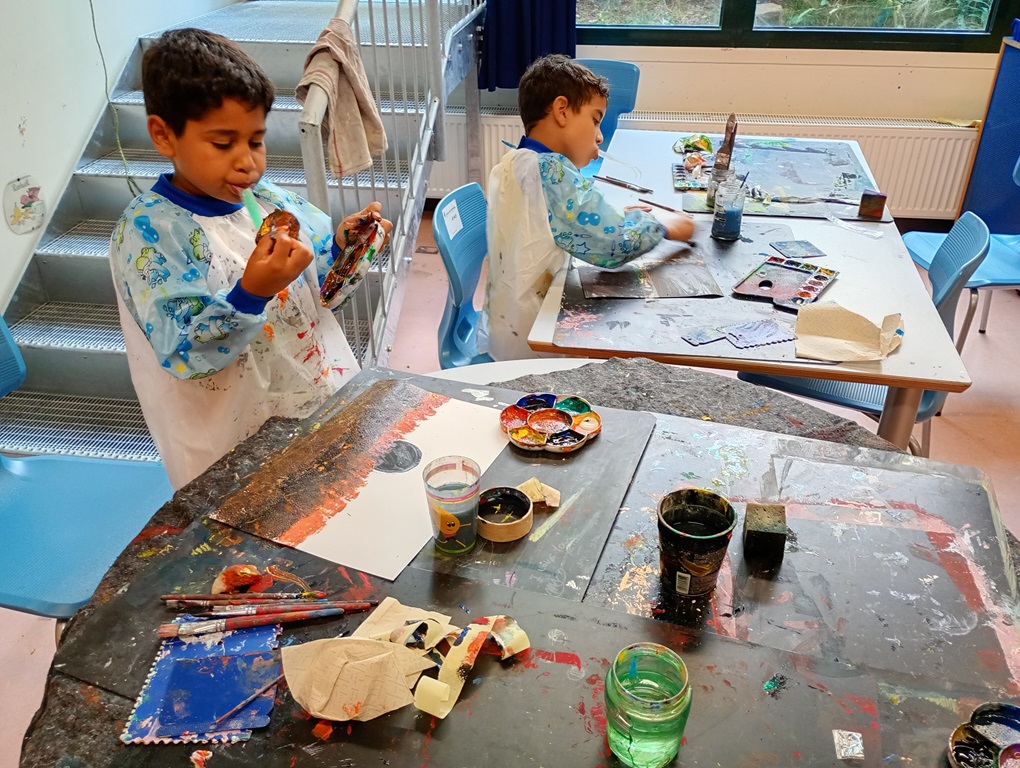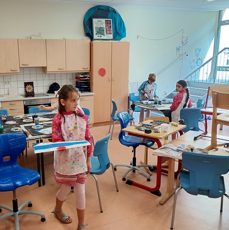 Schulsozialarbeiter Herr Blum sorgte für eine förderliche Atmosphäre, konstante Versorgung mit Material, sowie Hilfe und Hinweisen, wo das von den Kindern gewünscht war.